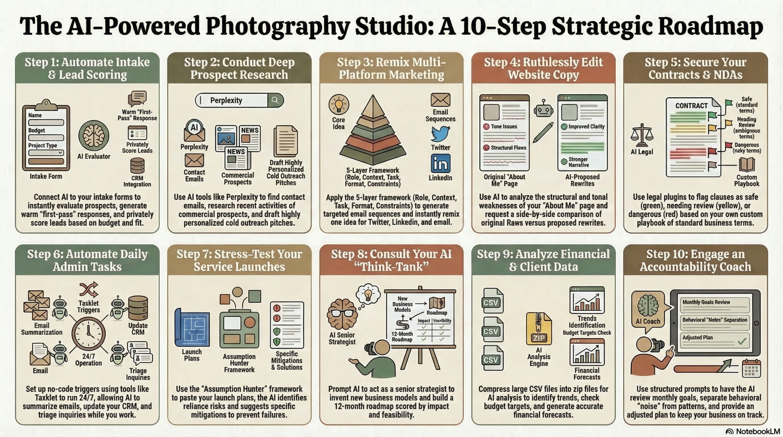 Don discussed the potential of AI to help photographers build their businesses by automating tasks and providing tools for client acquisition, email writing, business strategy, tax preparation, and contract review. He emphasized that while AI isn’t a final arbiter, it can significantly speed up and enhance processes that would otherwise require significant manual effort or expertise. Don highlighted specific tools like Claude for email writing, Perplexity for researching companies, and Gemini for contract analysis, while noting that many photographers haven’t yet leveraged AI for cold email outreach.